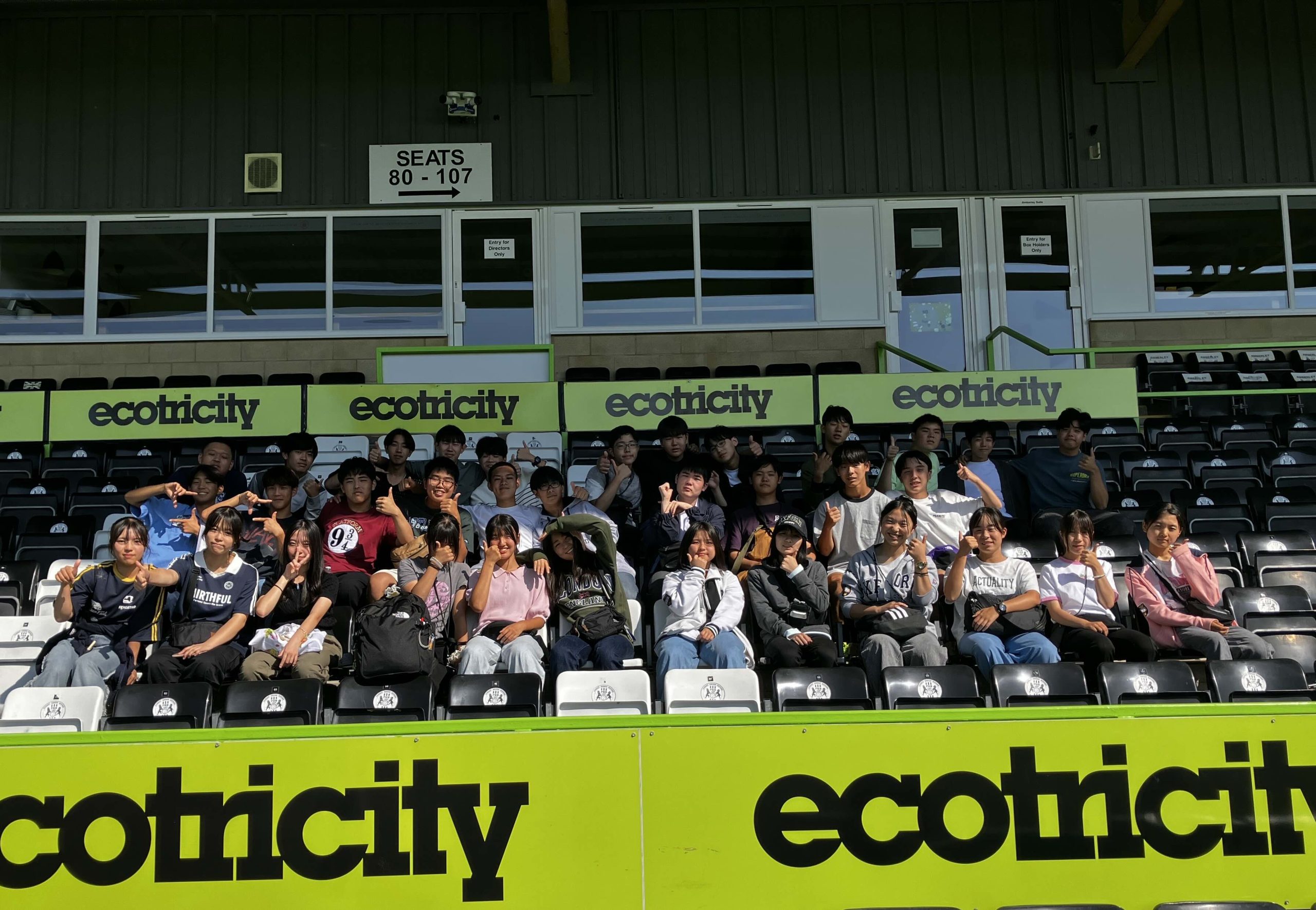 昼食は、ホストファミリーが用意してくれたお弁当を学校でいただき、午後はForest Green Rovers Football Club(フォレスト・グリーン・ローバーズFC)のホームスタジアムを訪問しました。このクラブは、世界で初めて「ビーガンクラブ」を宣言したイングランドのプロサッカーチームとして知られています。本拠地は生徒たちがホームステイをしているグロスタシャー州にあります。