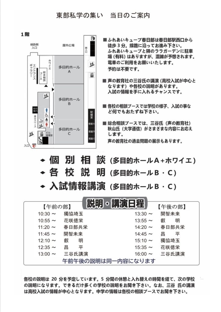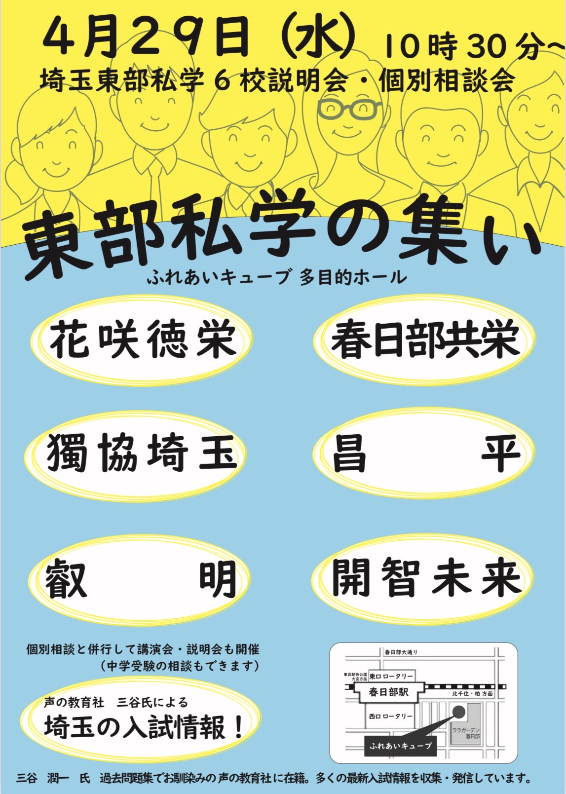 4月29日(水・祝)10:30〜16:30春日部ふれあいキューブにて埼玉東部地区の私学6校(叡明・開智未来・春日部共栄・昌平・獨協埼玉・花咲徳栄)の合同説明会「東部私学の集い」を開催いたします。