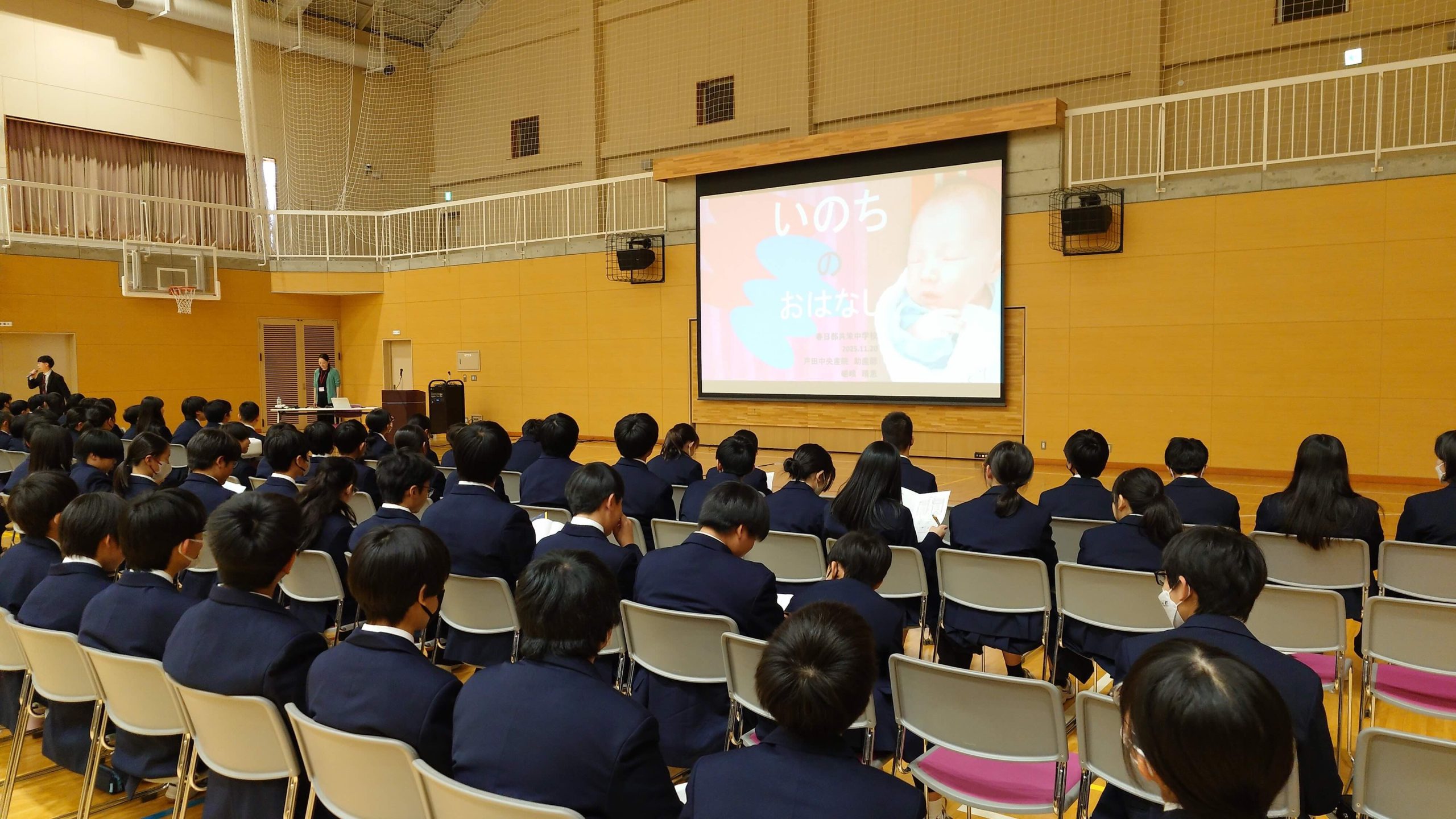 「いのちの大切さ、心と体の話」と題し、 嵯峨 晴惠 氏(戸田中央産院 助産師) をお招きして、第152回講演会を行いました。 どのようにして赤ちゃんが母親のお腹の中で育ち生まれるのか、生まれた時の周囲の感動などを通して、自己の生命の尊さを考えました。合わせて妊婦生活の不自由さを疑似妊婦グッズを使い体験しました。また、他者を理解し尊重することを目的とした、他者との付き合い方についても考えました。 多感な中学生だからこそ、これからも様々な分野の専門家をお招きし、講演会を行って参ります。