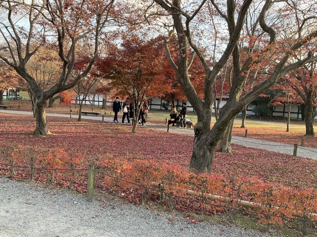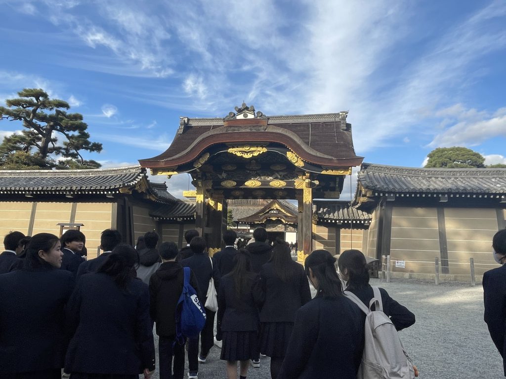 午後は大阪から京都に場所を移し、二条城へ。午前に訪れた大阪城との違いや、当時の建築が残る歴史的な空間に触れ、生徒たちは普段とは異なる学びと体験をしている様子でした。 二の丸御殿に入ると、鳥のさえずるような音がする「うぐいす張り」の廊下が続いており、生徒たちは耳慣れない音に驚いていました。 その後、豪華絢爛な内部や紅葉の見事な庭園を見て回り、休憩所でお土産や軽食などを楽しみました。