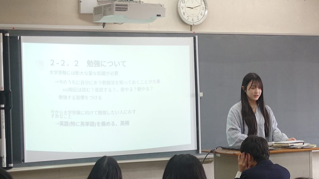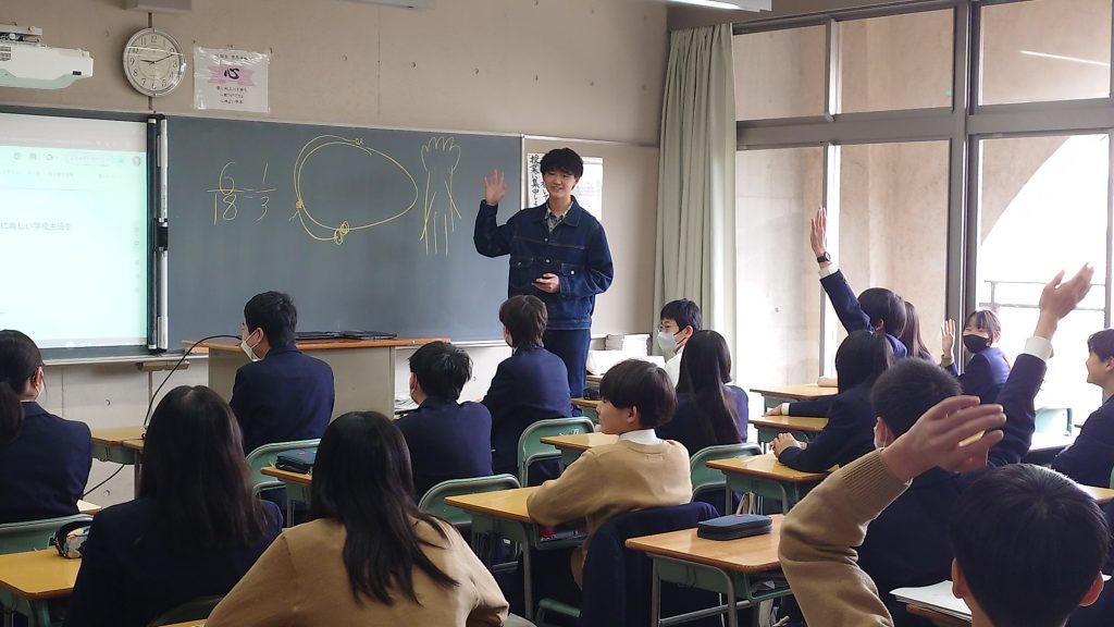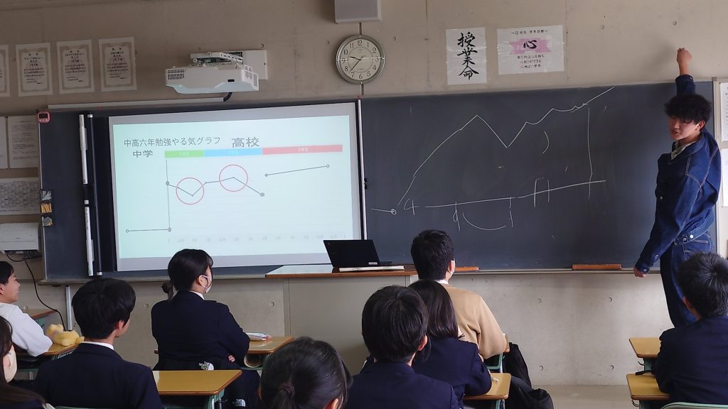 今年、本校の中高一貫を卒業した生徒たちが中学生の各クラスに来て、後輩たちに向け大学進学がどうであったのか、これからどう生活をし、どう学習をしていった方がよいのかなどを実体験を元に話をしてくれました。自身の中学時にこの「卒学会」で気持ちを切り替えて学習にスイッチが入った話や、部活動と学習活動は両立できるという話、大学受験に必要な基礎学力の重要性などの話をしてくれる先輩に食い入るような眼差しで聞き、中学生なりの今の悩みを相談してみたり、偏差値が上がったきっかけを聞いてみたりと多くの質問が出ました。